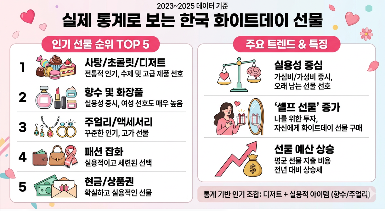 2025 화이트데이 선물 트렌드 분석: 사탕보다 '이것'? 통계로 본 인기 순위 TOP 5
