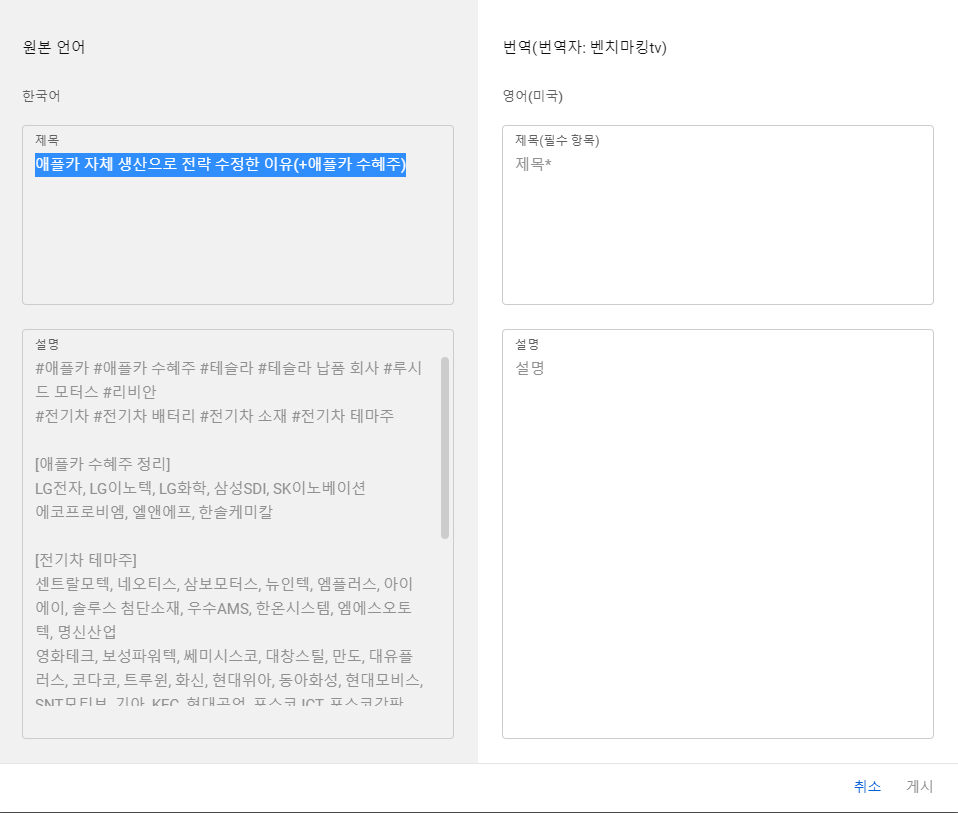 영어를 구사하시면 영어 제목과 설명을 넣는 것이 막히지가 않는데, 영어를 구사하지 못하면 제목과 설명을 넣는 것이 막히게 됩니다.