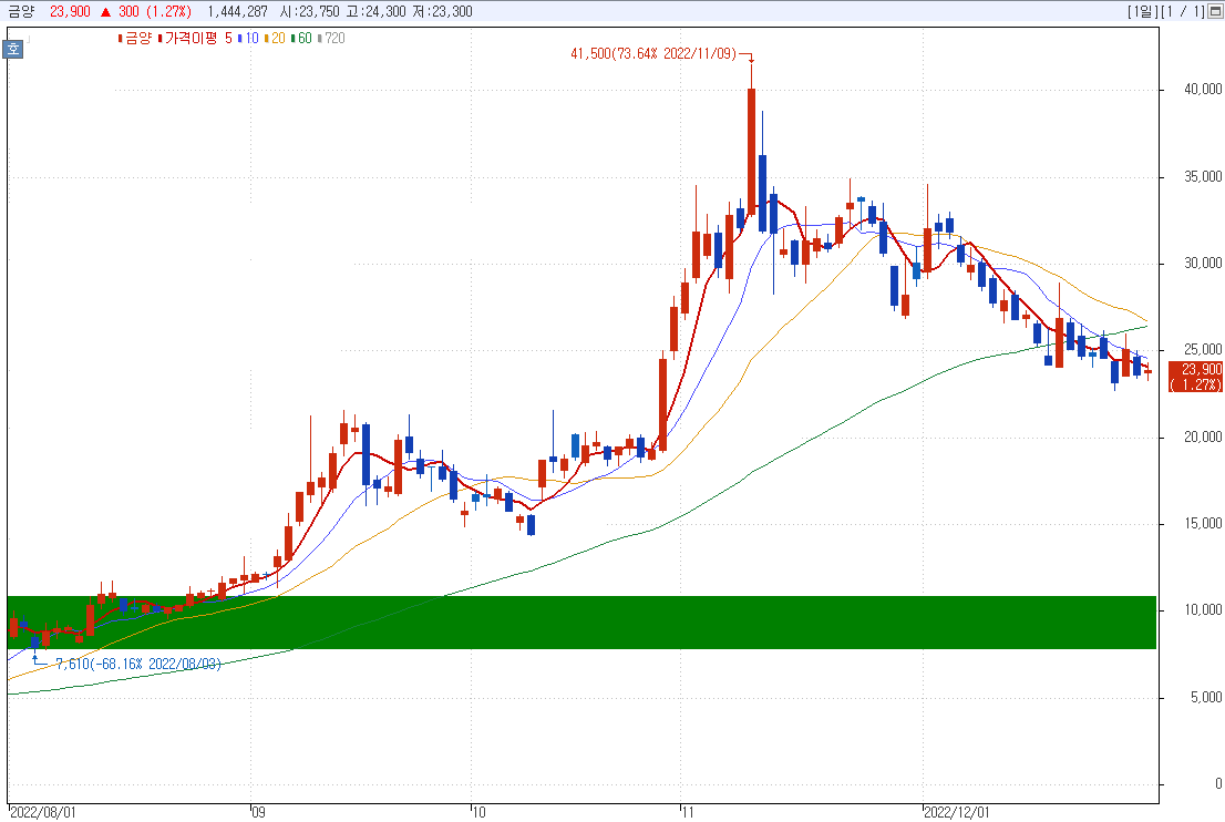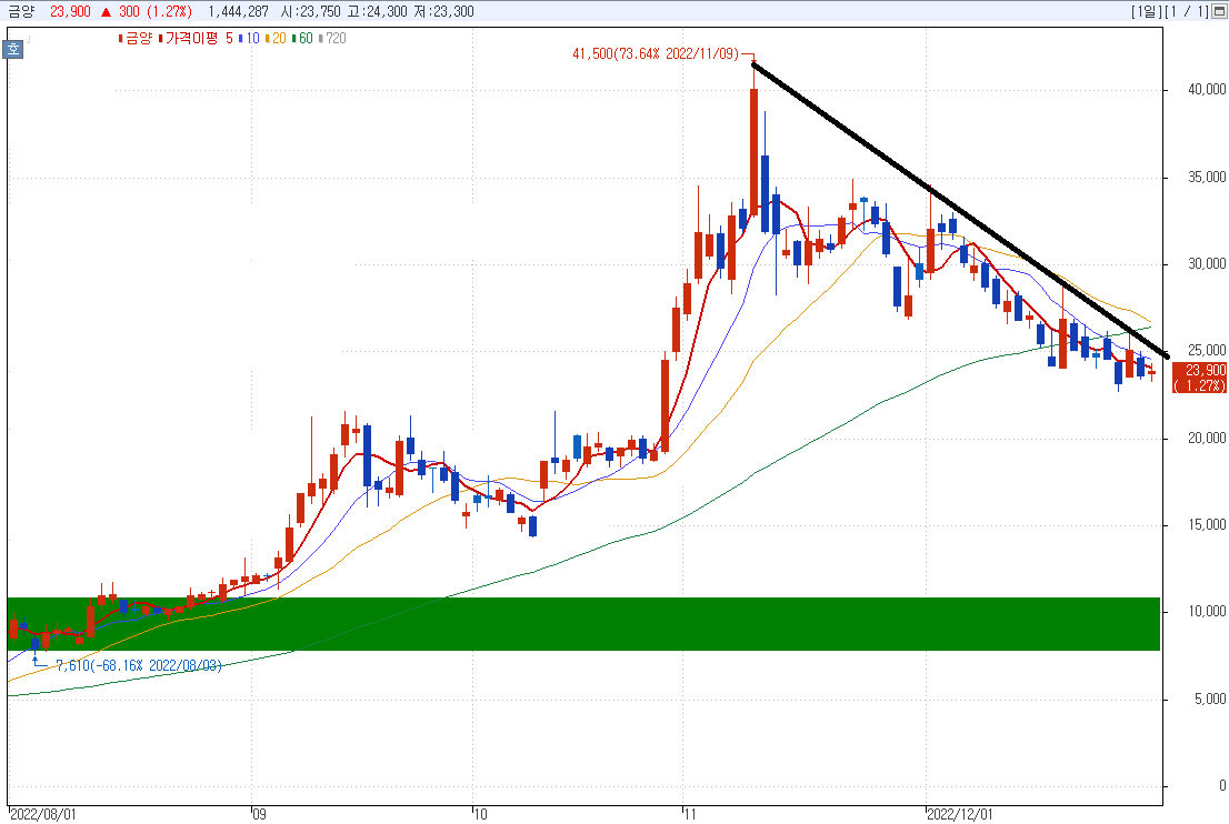 현재 금양의 일봉 차트는 위와 같은 하락 추세선을 그리고 있습니다.